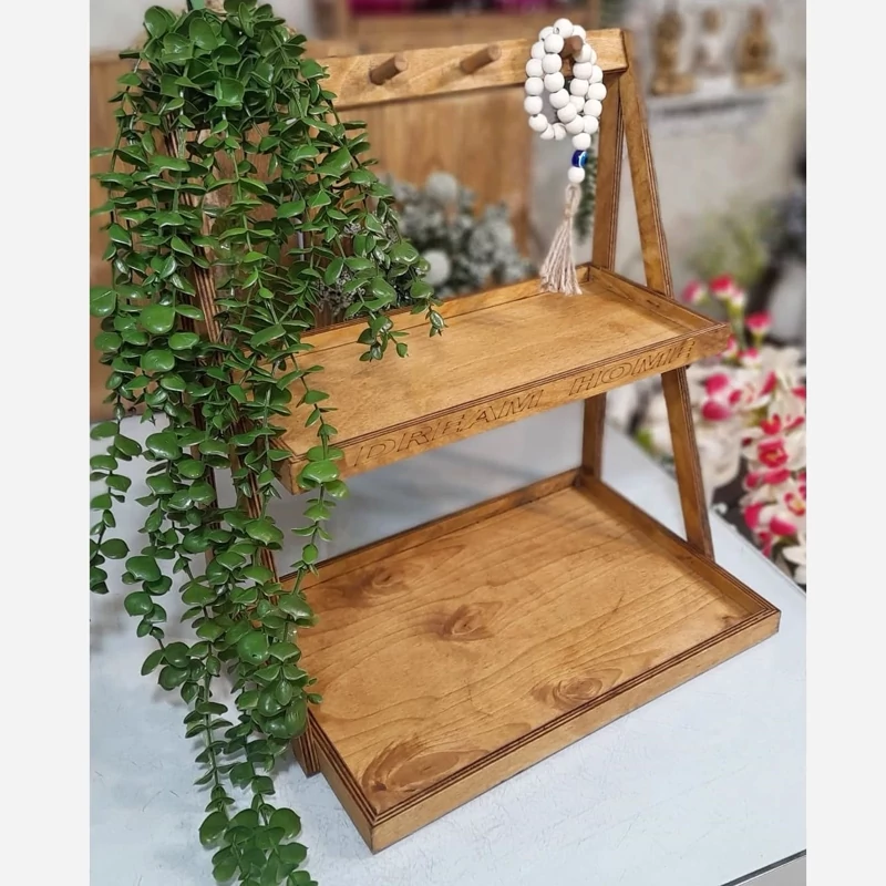 استند چوبی پاسماوری دو طبقه جای شات دار 6 عدد جای شات چوب ترمو روغن گیاهی خورده طول 34 سانت عرض 27 سانت ارتفاع 37 سانت