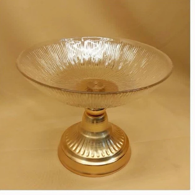 ظرف پذیرایی آجیل خوری سولو پایه دار فلزی طلایی ظرف شیشه ای رنگ شیشه شامپاینی پایه چسب خورده و قابلیت جدا شدن ندارد قطر 20 سانت ارتفاع 16 سانت