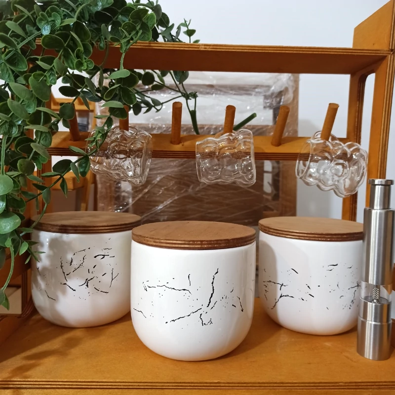 ست 3 عددی پاسماوری و جا ادویه بانکه استوانه ماربل کیفیت بالای سرامیک جنس «استون ور» سرامیک درجه 1 درب چوبی روغن گیاهی زده ضد آب اتفاع 10 سانت عرض 10 سانت تک کارتن