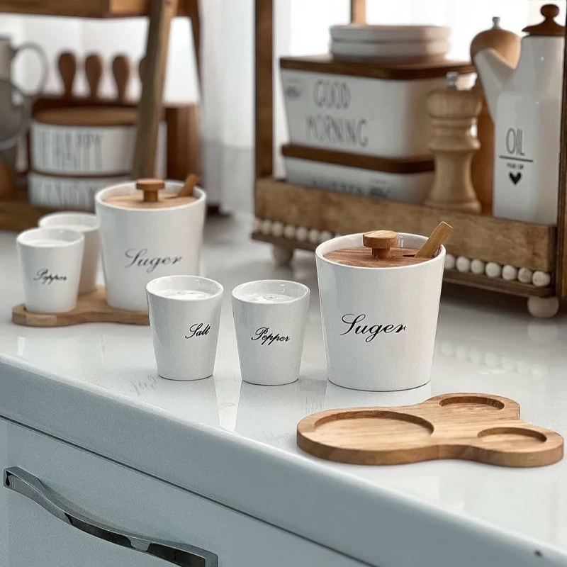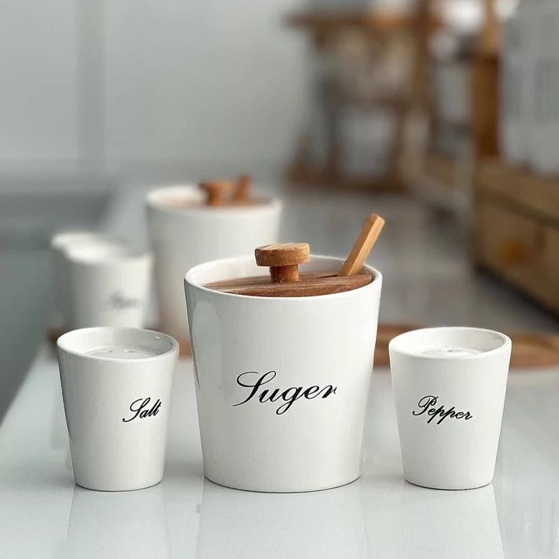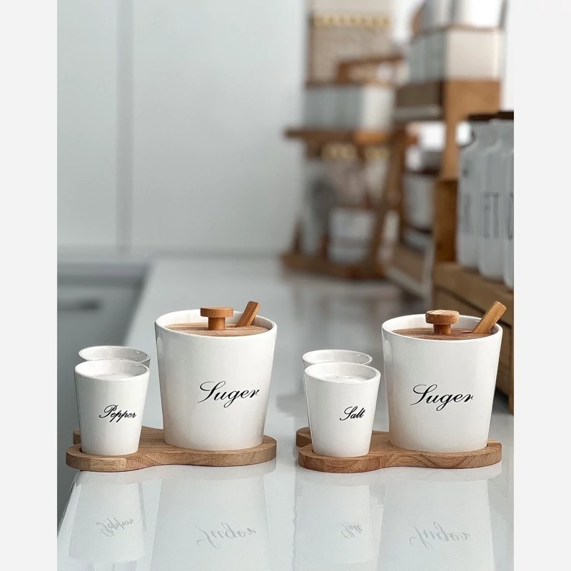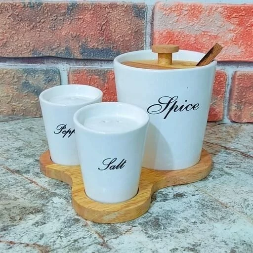 ست سه تایی سرامیکی زیره چوبی شامل بانکه شکر، به همراه قاشق چوبی 2 عدد نمک وفلفل پاش سرامیکی بانکه بزرگ شکر ابعاد : 9/5 در10 سانت بانکه کوچک نمک فلفل پاش ابعاد6در7سانت ابعاد زیره چوب:14در16 سانت