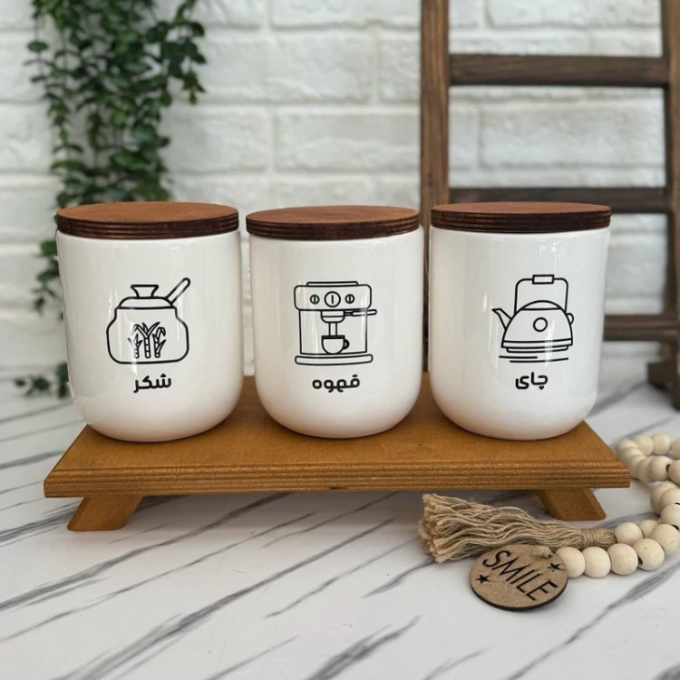 3 عدد بانکه استوانه فارسی نوشته تصویری کیفیت بالای سرامیک جنس «استون ور» سرامیک درجه 1 درب چوبی روغن گیاهی خورده ضد آب تک کارتن ارتفاع 13 سانت عرض 10سانت