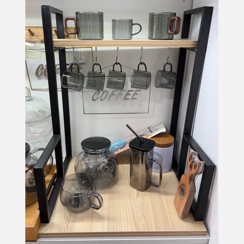استند چوبی فلزی اسپرسو کافی بار کیفیت عالی رنگ فلز کوره ای ضد زنگ دو طبقه 4 عدد چنگ آویز شات ارتفاع50 سانت عرض30 سانت طول38 سانت