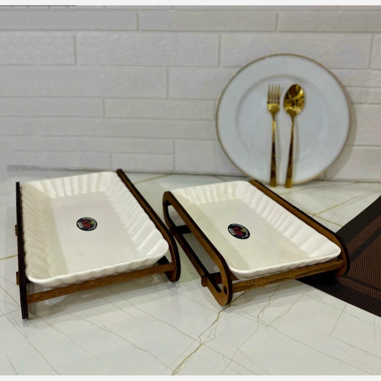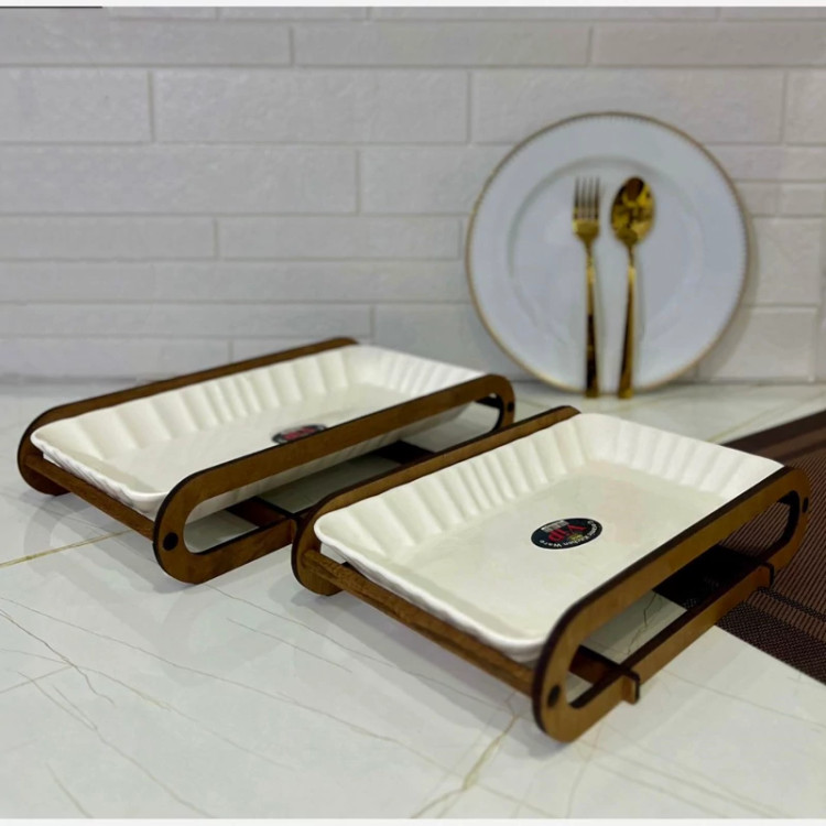 رولت خوری سرامیکی پایه چوبی مناسب پذیرایی جای خرما ، حلوا، انواع شیرینی، انواع غذا (ته چین، ته دیگ ، فینگر فود و ...) سایز کوچک عرض 17 طول 27 سایز بزرگ عرض 19 طول 32
