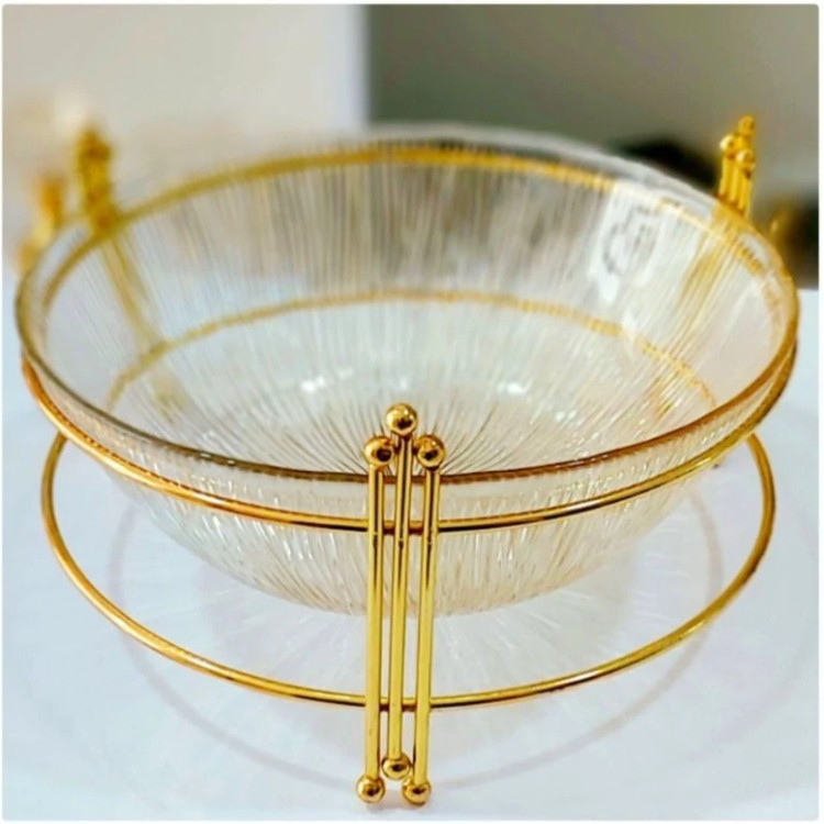 ظرف شیشه ای میوه خوری سولو شیار دار مدل پایه پیانو عرض 23 سانت ارتفاع10 سانت تک رنگ پایه و ظرف طلایی قابلیت جدا شدن پایه از ظرف