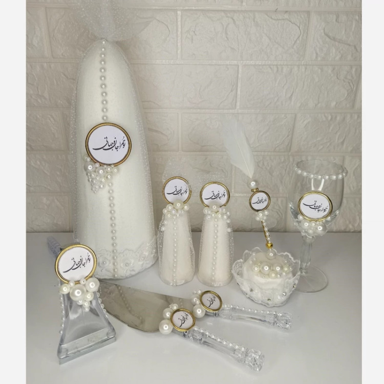 شامل ست کارد کیک بر، یک جفت قند ساب ،یک عدد کله قند، خودکار و جا خودکاری ، تیشه قند شکن، جام عسل