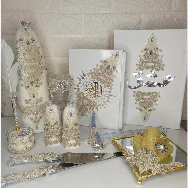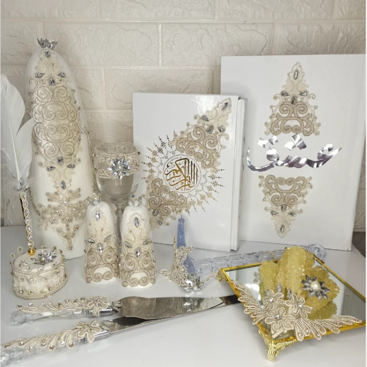 شامل قرآن قاب دار،دفتر جهیزیه،ست کارد کیک بر، یک جفت قند ساب ،یک عدد کله قند، خودکار و جا خودکاری ، شاخه نبات ، تیشه قند شکن، جام عسل